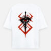 The design draws inspiration from dark fantasy symbolism, making it a standout piece for anime-inspired fashion lovers and streetwear enthusiasts. Its unisex oversized fit includes dropped shoulders, extra length, and a relaxed silhouette for a modern, effortless look.
