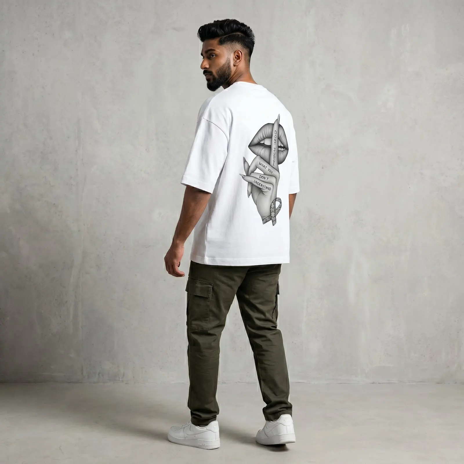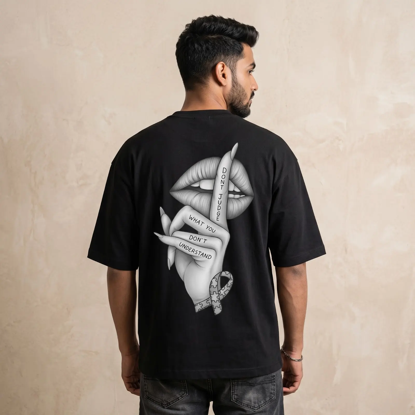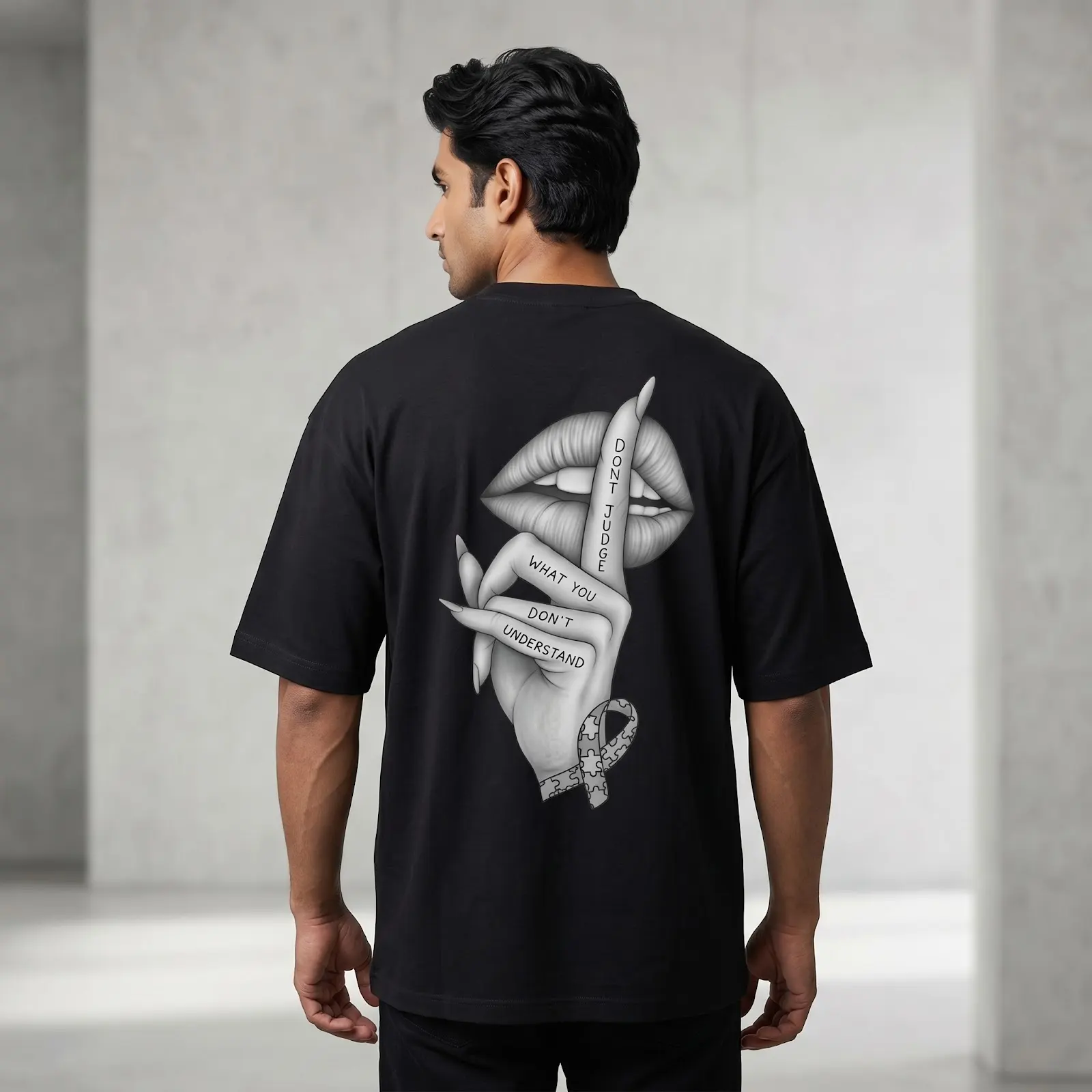 Featuring a striking monochrome graphic on the back, this T-shirt adds an artistic and expressive edge to your wardrobe. Pair it effortlessly with jeans, joggers, or shorts for a modern, urban look.Whether you’re heading out with friends or upgrading your everyday essentials, this oversized tee delivers the perfect blend of fashion and functionality.